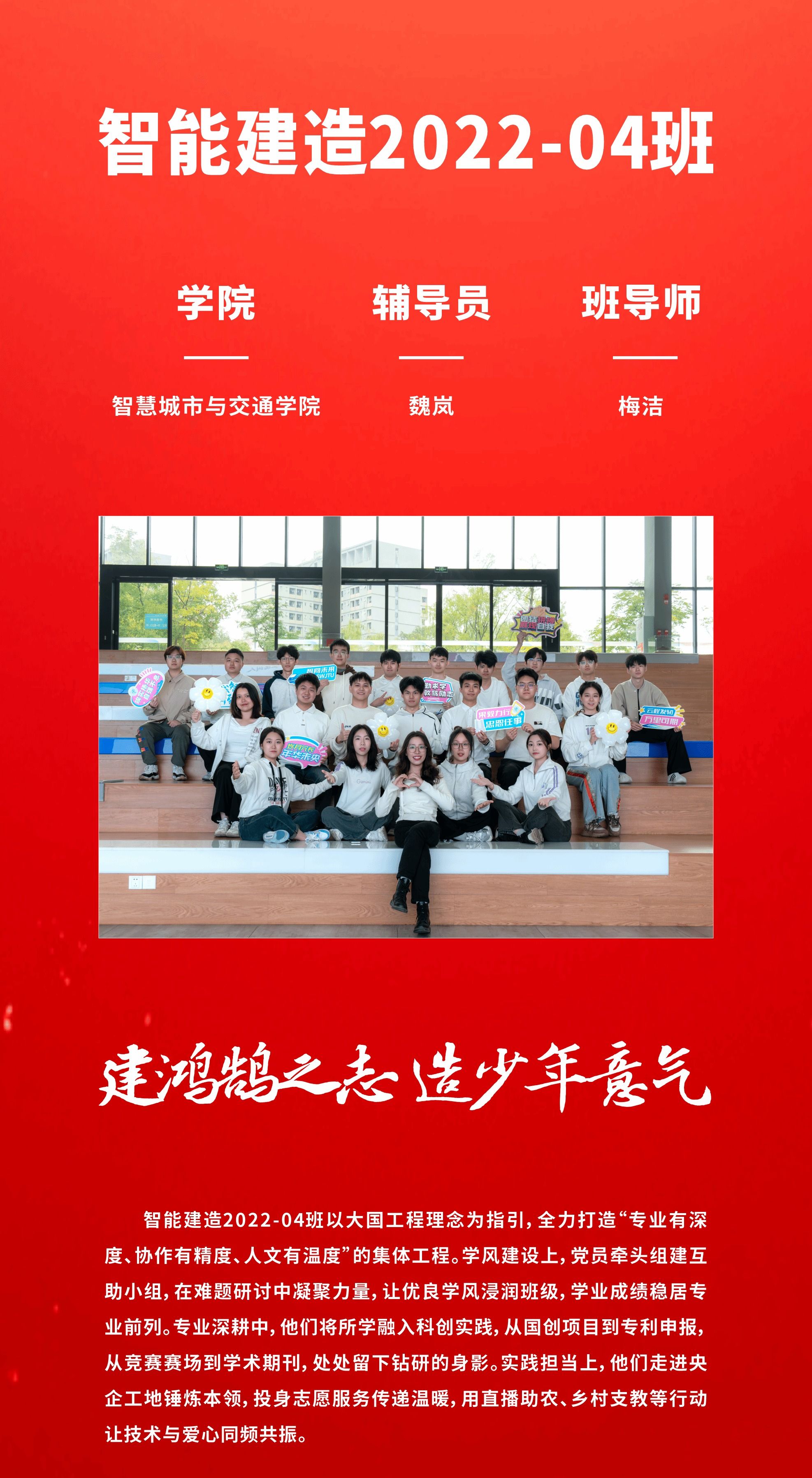 智能建造2022-04班始终以“大国工程”理念为指引,从共同擘画班级发展蓝图到日常点滴的温情凝聚,不仅见证了每位成员的蜕变成长,更铸就了集体的协同奋进之路。班级科研参与率实现100%,累计斩获10余项专利,发表一篇SCI、一篇EI论文;竞赛中,26项国家级、19项省级、9项校级奖项熠熠生辉;学业上,24人次斩获各类奖助学金,10人保送至中国科av影片直播大学、哈尔滨工业大学等知名学府,5人签约轨道交通行业龙头央企,2人出国深造,毕业去向落实率达77%。此外,班级还涌现出“自强之星”“勤工助学之星”等先进个人,众人共同将班级打造成兼具专业深度、协作精度与人文温度的“集体工程”。