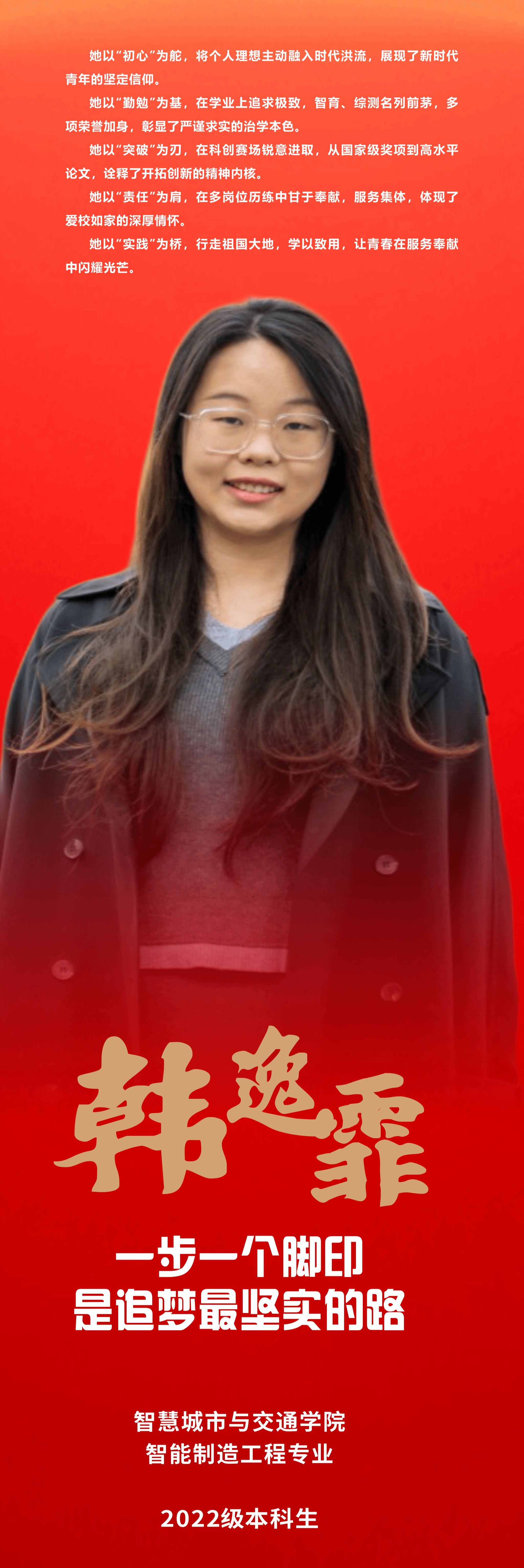 她,是智能制造领域的追光者,亦是制造强国路上的追梦人。她是2022级首批中共党员,以先锋担当践行初心,用实干传递榜样力量;是社会实践的先行者,牵头7支实践队伍奔赴多地,扎根产业调研与红色实践,坚定科技报国信念;是创新攻坚的探索者,连续三年获评国家奖学金,连续三年获评三好学生标兵,深耕智能传感研发,成果发表于JCR一区期刊,斩获多项国家级省级奖项。一步一个脚印,是追梦最坚实的路,她以扎实步履为智能制造事业添砖加瓦,用竢实扬华的精神书写新时代学子的担当答卷。